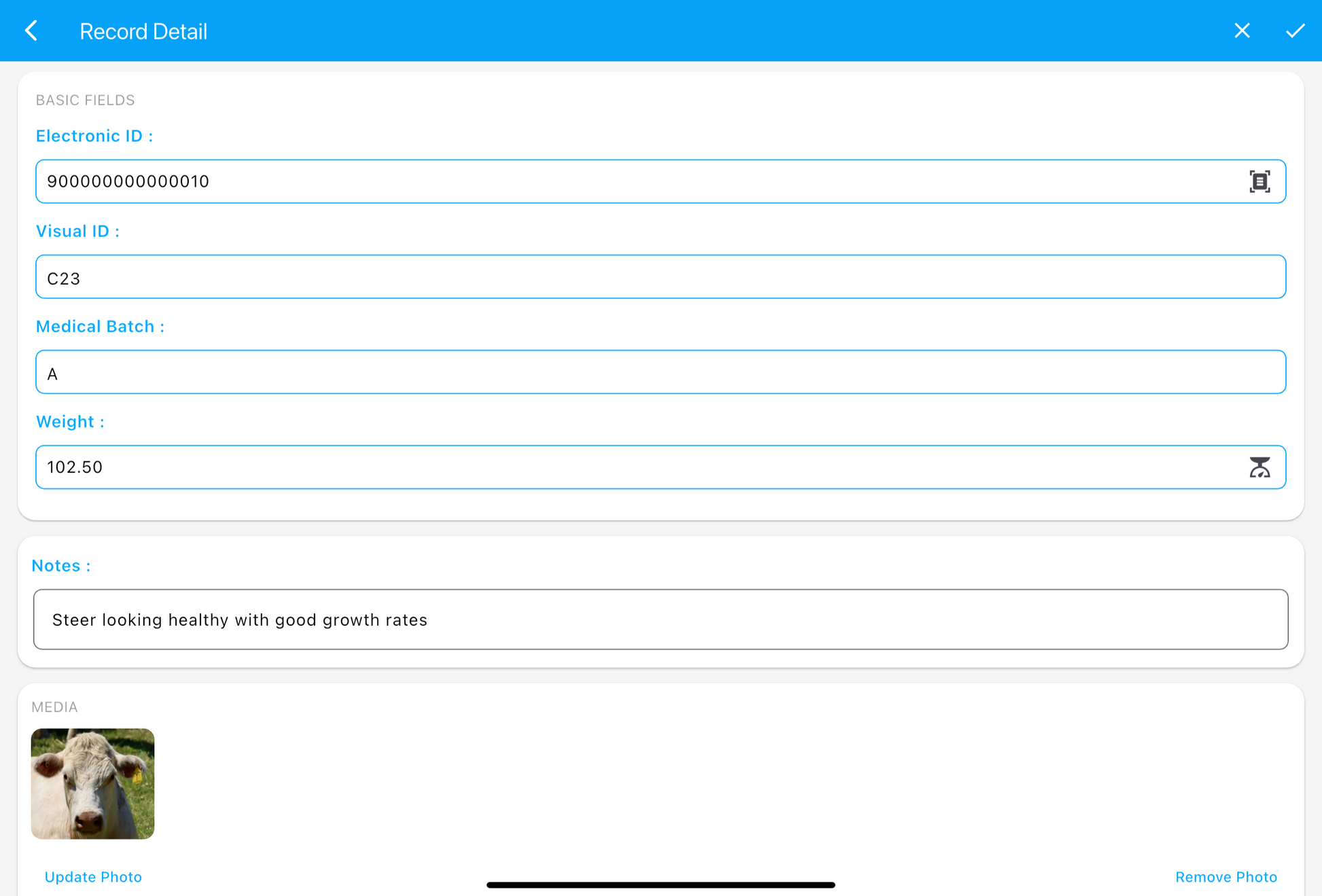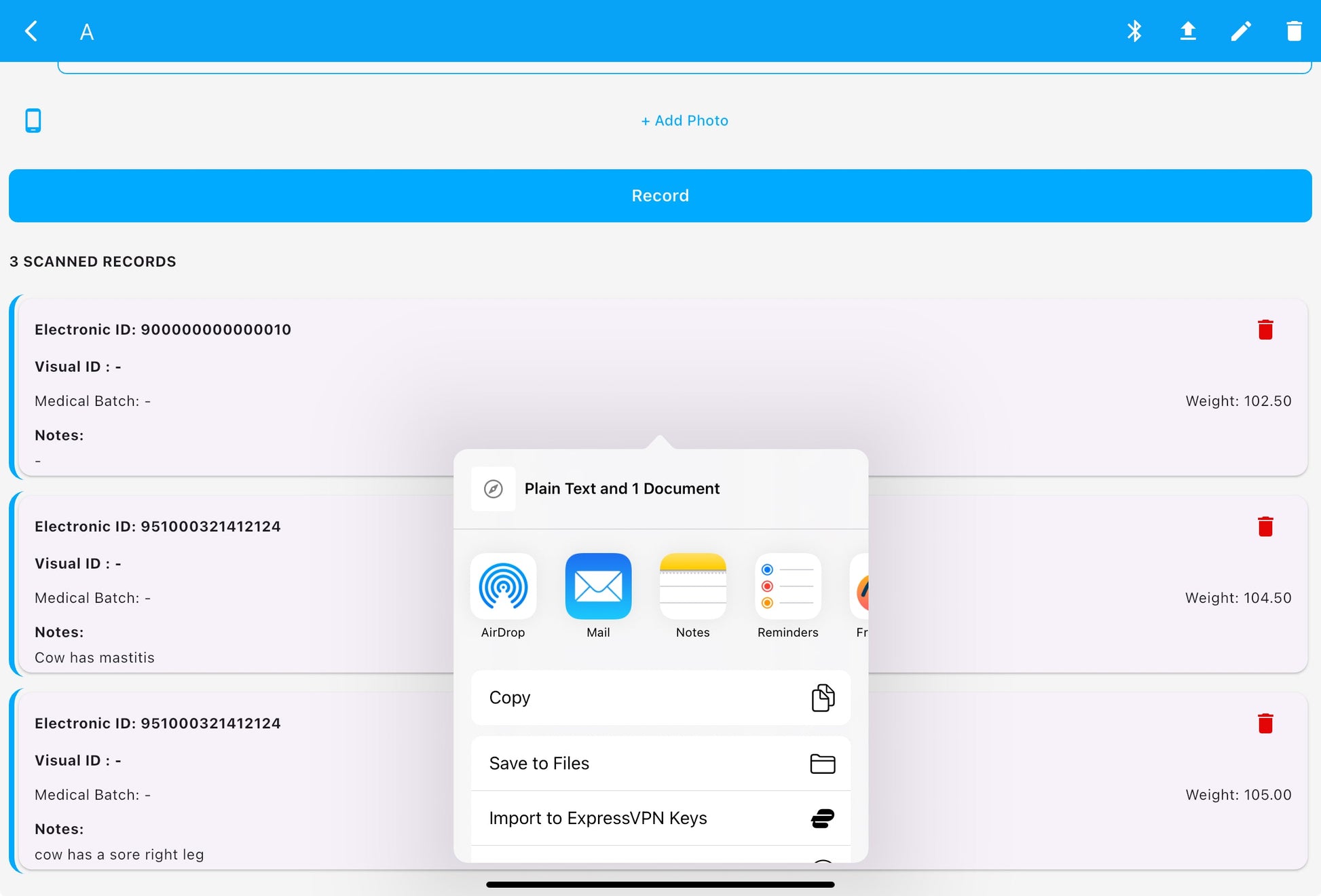 In this demo there is an AgriEID smart electric ear tag reader but this is not required as session records can be saved with a visual tag and / or photo ID etc.
